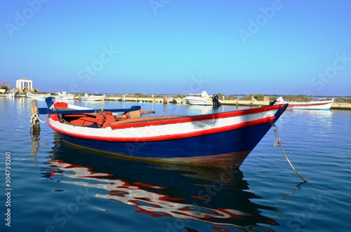 Lefkada, Lefkada Island, Greece. 10/22/2019. wooden ship blue, white and red color, fishing boat on the water in the port on the pier