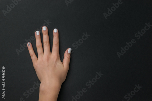 Left hand of a girl with a light manicure on a black background.