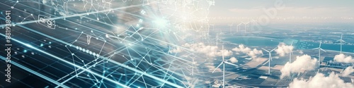 left side of the picture only artificial intelligence, in the middle only one solar panel field supplemented by the letters "ai", right side only wind power plants; view from above, in the background