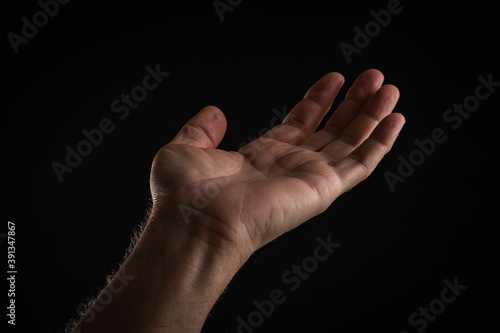 Left wrinkled palm asking for help on a black background.