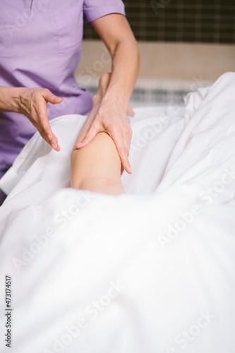 Leg massage therapy Hands on leg making massage massage woman hands masseur to boot rubdown. Foot massage