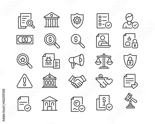 Legal and financial outline icon set with symbols of law, bank, contract, privacy, and money