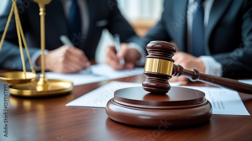 Legal concept scene showing courtroom gavel, balance scales, and professional attorneys at table working on law case paperwork in traditional setting