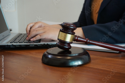 Legal counsel presents to the client a signed contract with gavel and legal law. justice and lawyer law of advisor Concepts