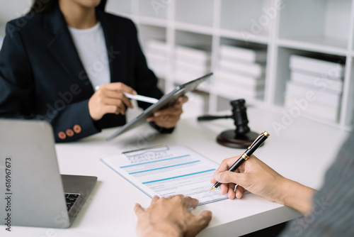 Legal counsel presents to the client a signed contract with legal law. justice and lawyer concept in office.