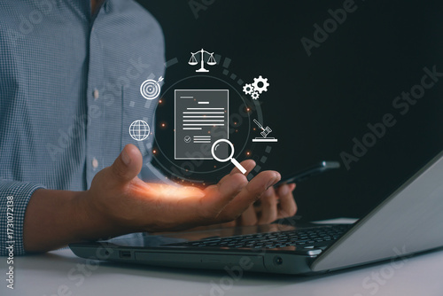 Legal document review and compliance concept with digital contract, magnifying glass, law icons, representing regulation, business agreement, professional document analysis for corporate governance.