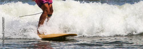 Legs of a surfer on a yellow board at the end of his ride