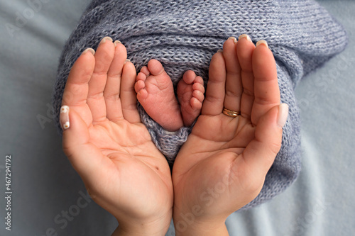 Legs, toes, feet and heels of a newborn. With the hands of parents, father, mother gently holds the child's legs.