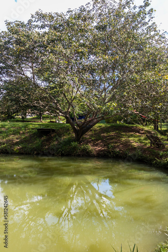 Leisure and rest area with woods on the shores of the lake with a small wooden deck and a house in the background with a hammock on the yard, located in Brazil