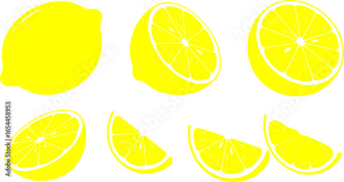 Lemon cut slices vector set, Whole, half and slice chopped lemon fruit flat collection
