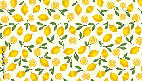 Lemon pattern with yellow fruits and green leaves on cream background