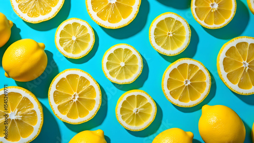 Lemon slices and whole fruit arranged on bright blue background creating fresh and vibrant summer feeling