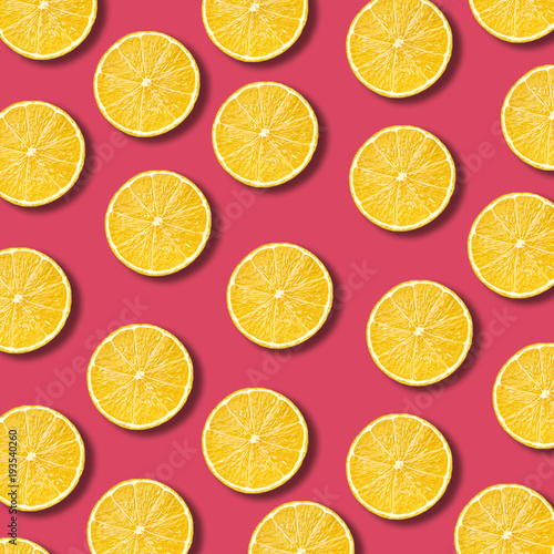 Lemon slices pattern on vibrant pomegranate color background. Minimal flat lay food texture