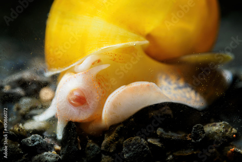 Lemon snail crawling on rocks and nibbling algae on glass.