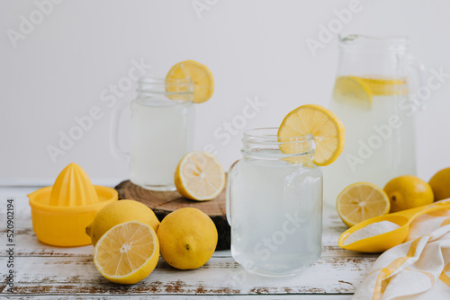 lemonade drink with yellow lemons or lime on Jar and glass on white background in Latin America