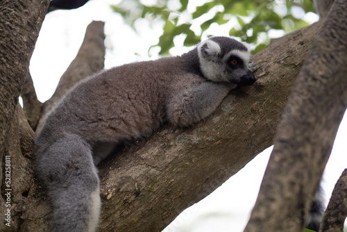 Lemur against a green background. Portrait of a ring-tailed lemur. Lemuriformes.