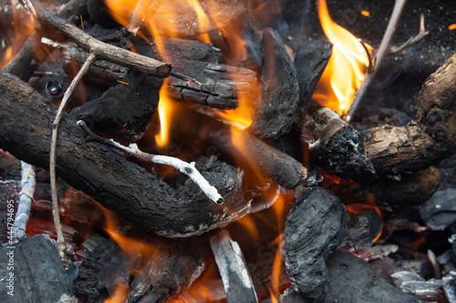 Leña y carbón ardiendo para la barbacoa