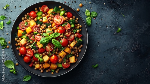 Lentil salad with vegetables in bowl Grey background Top view : Generative AI