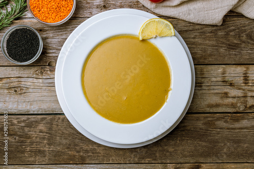 Lentil soup with lemon on wooden table. Turkish cuisine