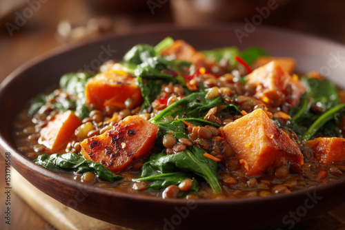 Lentil stew with sweet potato and spinach in rustic bowl, showcasing vibrant colors and textures