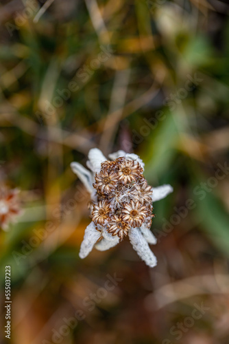 Leontopodium nivale flower growing in mountains, close up