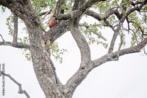 Leopard grooming in a tree watching his prey in Kruger National park, South Africa ; Specie Panthera pardus family of Felidae