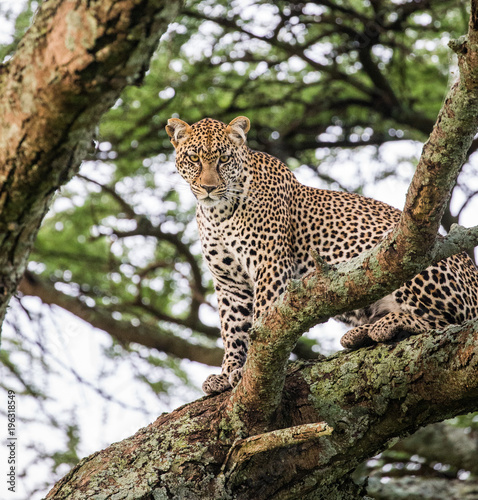 Leopard on a tree. National Park. Kenya. Tanzania. Maasai Mara. Serengeti. An excellent illustration.