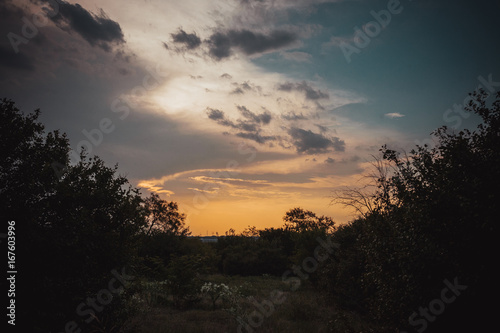Лес в лучах закатного солнца на фоне предгрозовых туч