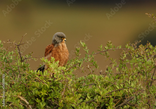 Lesser kestrel, Falco naumanni, small falcon, close up photo of a male perching on a branch against a blurry green background. Wintering falcon, South Africa.