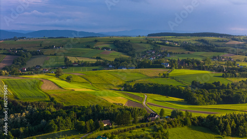 Lesser Poland rolling hills and rural landscape near Ciezkowice. Aerial drone view