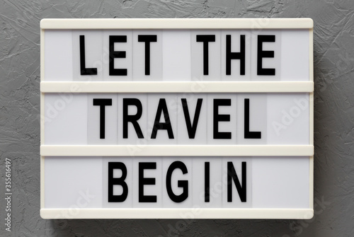 'Let the travel begin' on a lightbox on a gray surface, top view. Flat lay, from above, overhead. Close-up.