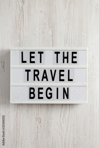 'Let the travel begin' on a lightbox on a white wooden background, top view. Flat lay, from above, overhead.
