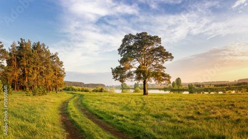 летний пейзаж на Уральской реке с деревьями на берегу, Россия, июнь,