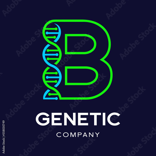Letter B Genetic DNA vector logo template. Design with chromosome symbol. This logo is suitable for research, science, medical, logotype, technology, lab, molecule, protein, nucleus, spiral.