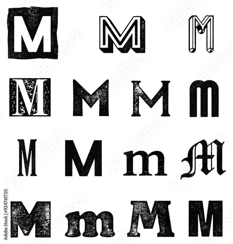 Letter M typography set of characters in various styles with distressed eroded texture isolated on transparent background