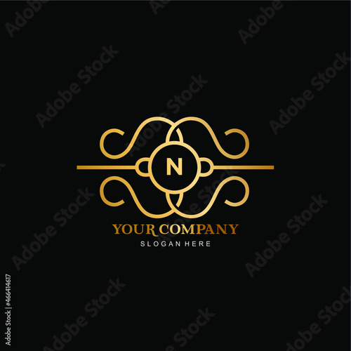 letter N vector logo and gold frame. simple and elegant gold frame line art with letter N .premium letter N vector template