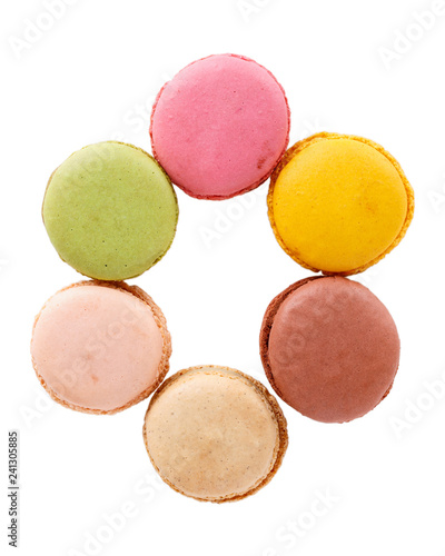 Letter O from multi-colored macaroon cookies. Flat lay, top view, isolated on white.