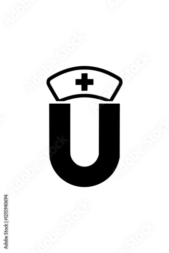 Letter U with nurse hat illustration, Creative design of the letter U featuring a nurse hat with a medical cross, symbolizing healthcare, nursing, and medical services.