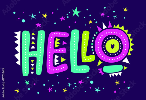Lettering Hello, letters Hello on background with stars. Ideal for web, banner, tag, invitation