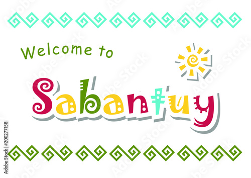 Lettering of Welcome to Sabantuy with colorful letters and sun in paper cut style with shadows on white background decorated with ornament for national bashkir and tatar summer festival