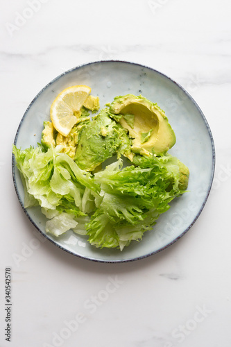 lettuce and avocado in rustic plate on white marble background