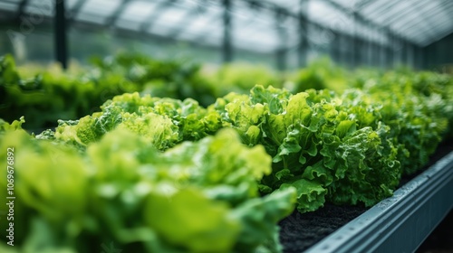 Lettuce Plants Growing in Greenhouse Rows. Close-up view of green lettuce plants thriving in rows inside a greenhouse, representing modern agricultural practices and organic growth.