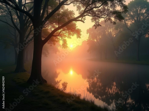 Lever de soleil brumeux sur rivière calme entourée d’arbres et nature paisible au petit matin