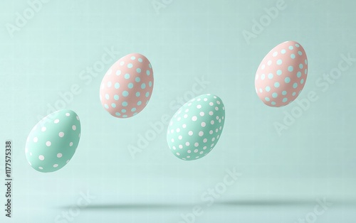 Levitating subtle pastel-toned eggs with polka dots on a pale mint background