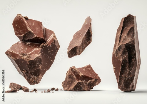 Levitation Photography of Dark Brown Chocolate Pieces Against White Background