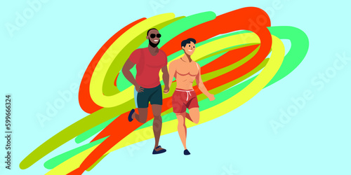 LGBTQ community concept. Happy young gay people with LGBT rainbow flag running together and smiling holding hand vector illustration