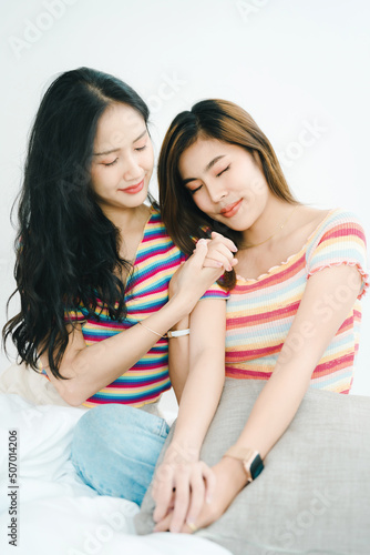 lgbtq, lgbt concept, homosexuality, portrait of two Asian women posing happy together and showing love for each other while being together