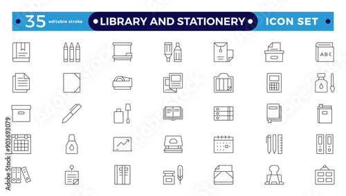 Library and stationery icon set. Contain linear outline icons like College, Knowledge, University, Book, Study, Certificate, Student, Library, Lesson, Stationery. Editable stroke outline icon.