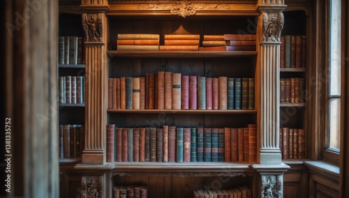 Library shelves filled with many old books. Wooden shelves contain rows of brown, red, and green books. Bookcases display various sized books in library.