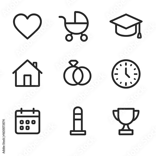 Life and Process Icons. Outline icon set of life timeline: heart, baby carriage, graduation cap, house, wedding rings, clock,